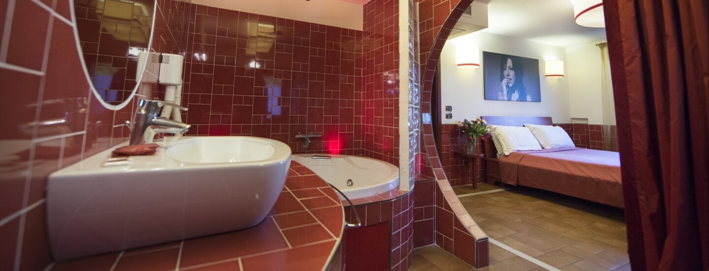 Das Zimmer wird ihre geheimen Sehnsüchte wahr werden lassen: Es gibt Spiegel für die Eitelkeit, ein Whirlpool für jene, die das Bedürfnis haben umschmeichelt zu werden und ein übergroßes Bett für Ihre heißesten Träume.