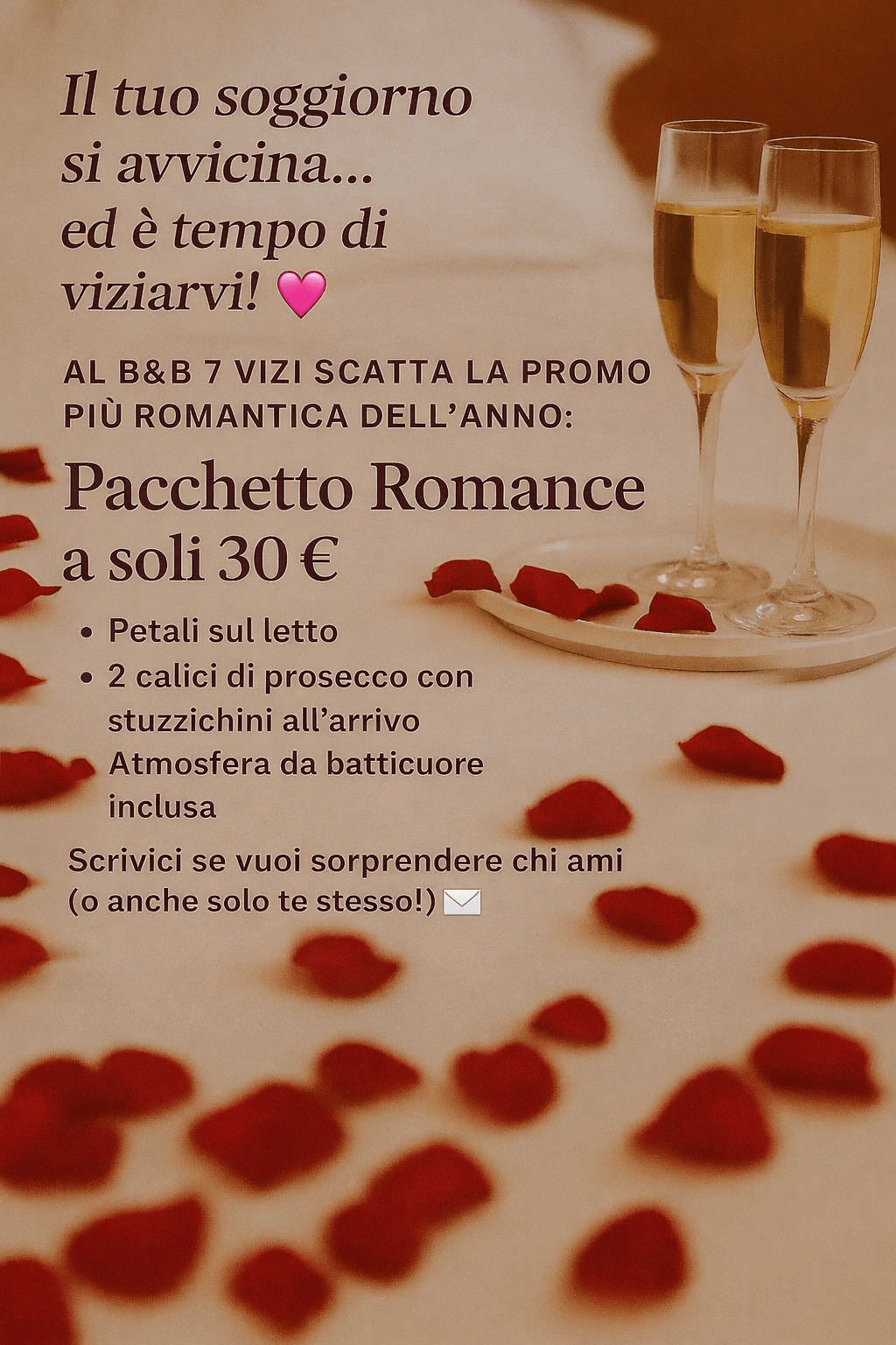 Perfetto per le coppie che vogliono celebrare un’occasione o godere di una serata insieme il nostro ROMANCE PACKAGE include petali di rosa sul letto, cioccolatini e una bottiglia di Prosecco ghiacciata per i vostri momenti insieme.